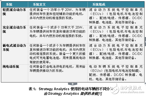 隨著世界范圍的人們對更高能源效率的交通方式的需求增加,HEV/EVs將首當其沖,成為人們的首要選擇的交通方式。為了更好的了解電動與混合動力車輛市場的潛力與發(fā)展情況,我們不可避免的要知道在本文中提到的是什么類型的車輛。在Strategy Analytics[1]的報告中:“2007年到2021年混合動力車輛系統(tǒng)的需求預測,”將HEV/EV分為四類: